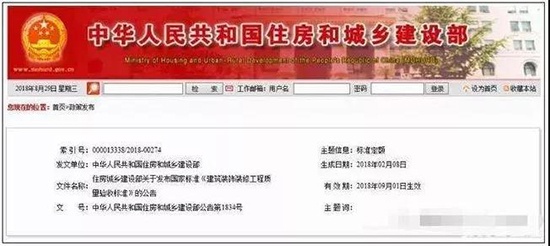 现批准《建筑装饰装修工程质量验收标准》为国家标准,编号为GB50210-2018,自2018年9月1日起实施。